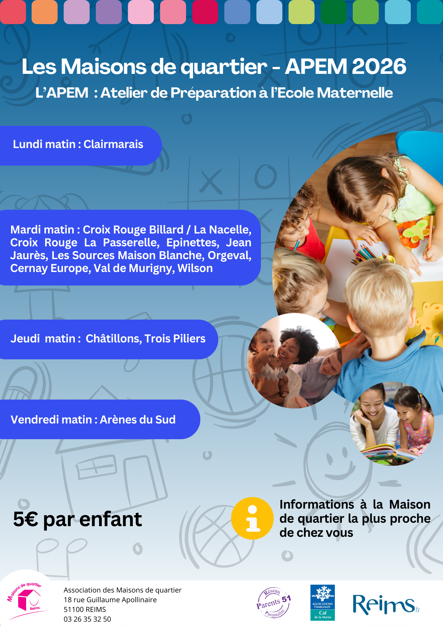 📍 Retrouvez les jours des ateliers et les Maisons de quartier qui proposent l’APEM ci-dessous.