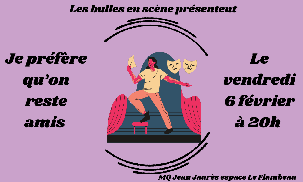 Les BULLES en SCENE présentent « Je préfère qu’on reste entre amis » d’après une comédie de Laurent RUQUIER, mise en scène par Catherine Erignoux.