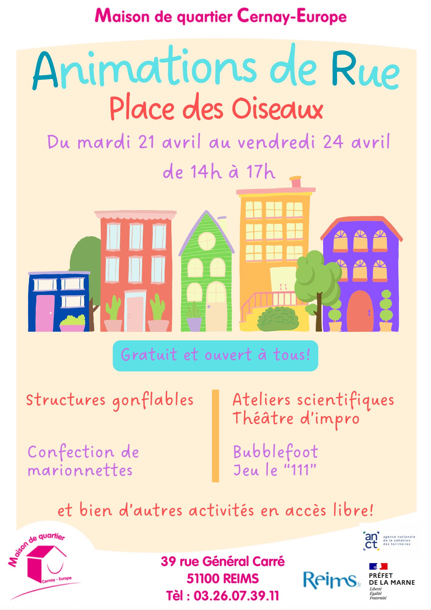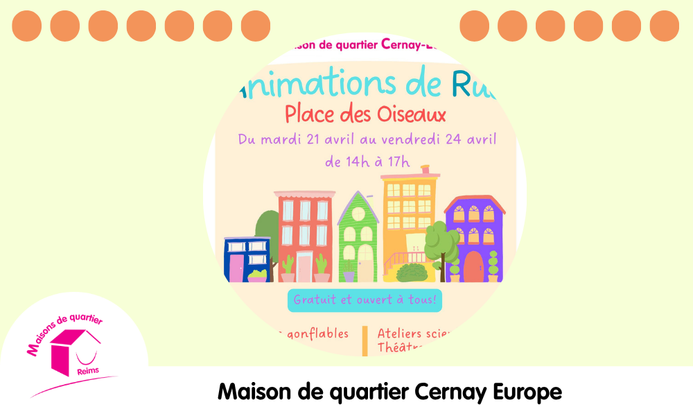 La Maison de Quartier Cernay-Europe sort de ses murs pour venir à votre rencontre ! Du mardi 21 avril au vendredi 24 avril, la Place des Oiseaux se transforme en un véritable terrain de jeu et d’échange pour les petits comme pour les grands.