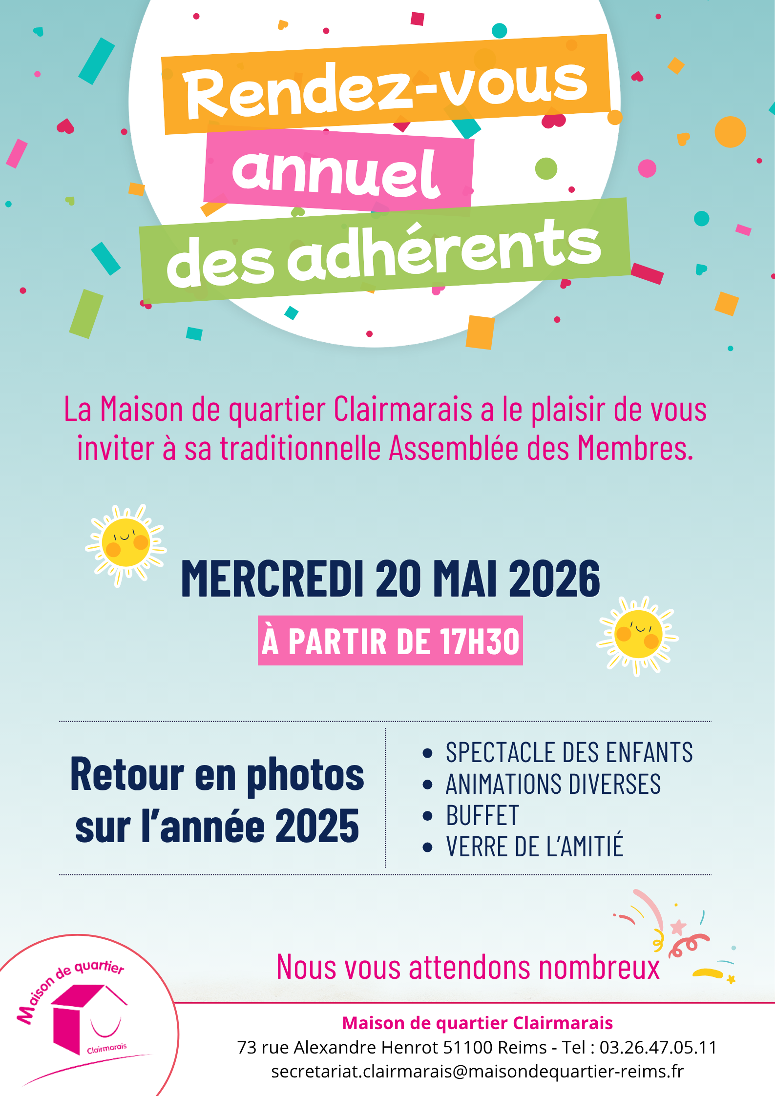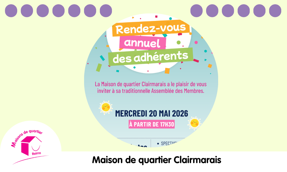 Infos auprès de la Maison de quartier Clairmarais : 03.26.47.05.11 ou clairmarais@maisondequartier-reims.fr