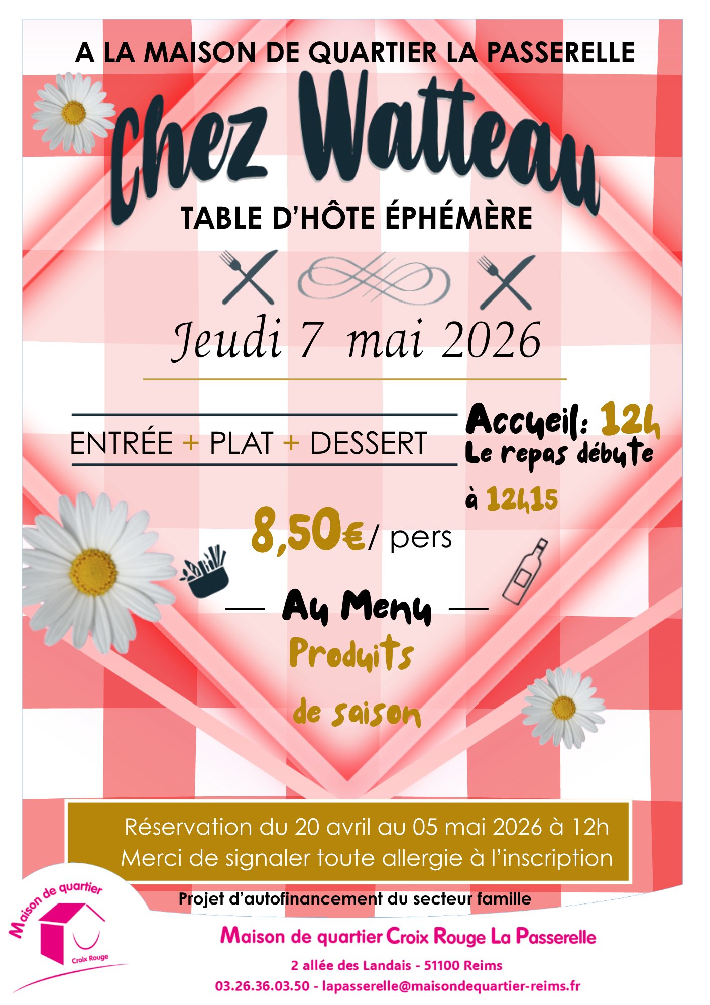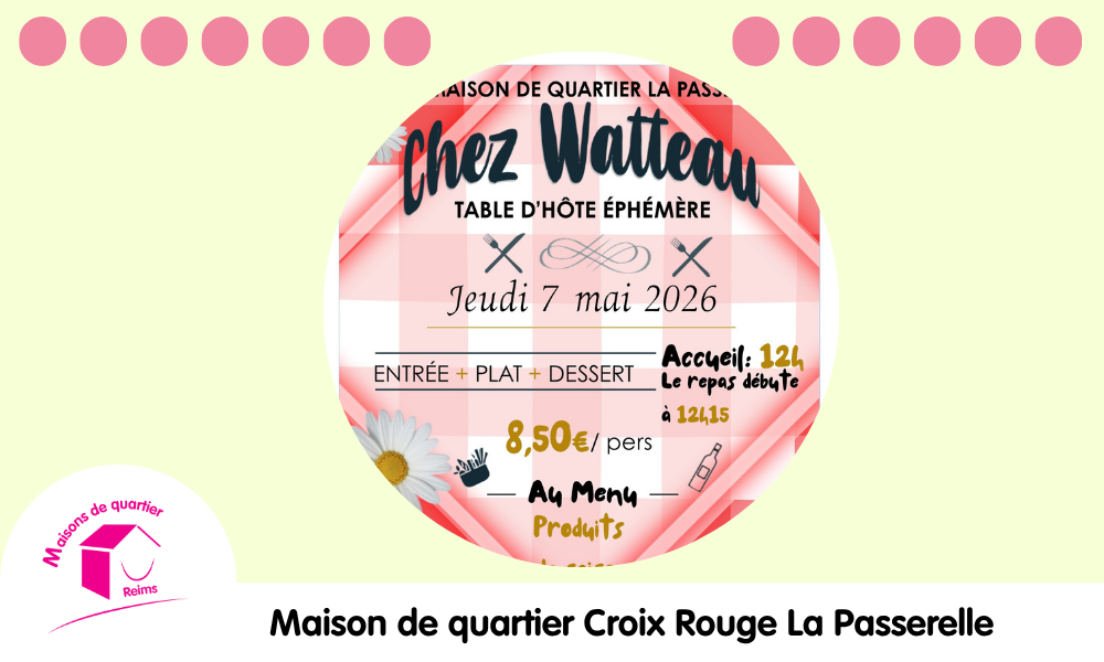Le secteur famille de la Maison de quartier La Passerelle vous invite à une nouvelle édition de sa table d’hôte éphémère, « Chez Watteau », le jeudi 7 mai 2026.